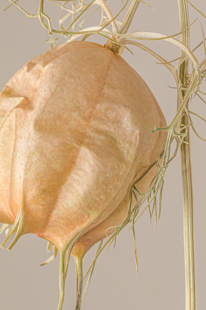 "Ländliche Einfachheit: Kopf hoch! Eine getrocknete Jungfer im Grünen lässt den Kopf hängen" ist ein Makrofoto einer getrockneten Buchsfrucht der Jungfer im Grünen (auch Nigella Damascena genannt).