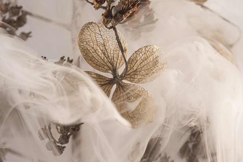 "Landelijk tafereel met een vleugje rook", toont een hortensiablaadje, met zijn delicate vorm en fijne nervenstructuur, die wordt omhuld door een sluier van rook. De rook lijkt zich als een zachte sluier om het blad te wikkelen. Het is een beeld van fragiliteit, maar tegelijkertijd van kracht; Eine Momentaufnahme, die die…