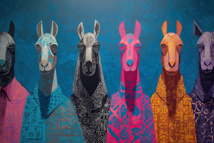 Lama Party – Dieses farbenfrohe Gemälde zeigt eine Gruppe von fünf auffälligen Lama-'en mit unterschiedlichen Mustern und Farben vor einem leuchtend blauen Hintergrund, was dem Ganzen einen zeitgemäßen und verspielten Charakter verleiht.