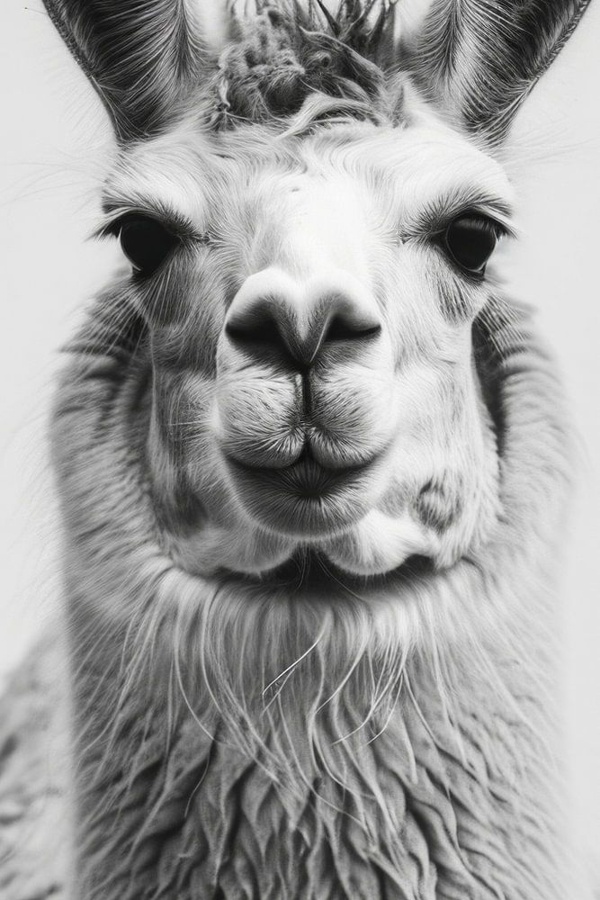 Dieses Schwarz-Weiß-Porträt eines Lamas besticht durch seine detaillierte Darstellung und den charmanten Ausdruck des Tieres. Die klaren Kontraste und die feinen Details des Fells verleihen dem Bild eine zeitlose Eleganz. Perfekt für Liebhaber von Tieren und minimalistischer Kunst, bringt dieses Kunstwerk eine ruhige und stilvolle Note in jede Wohn- oder Arbeitsumgebung.