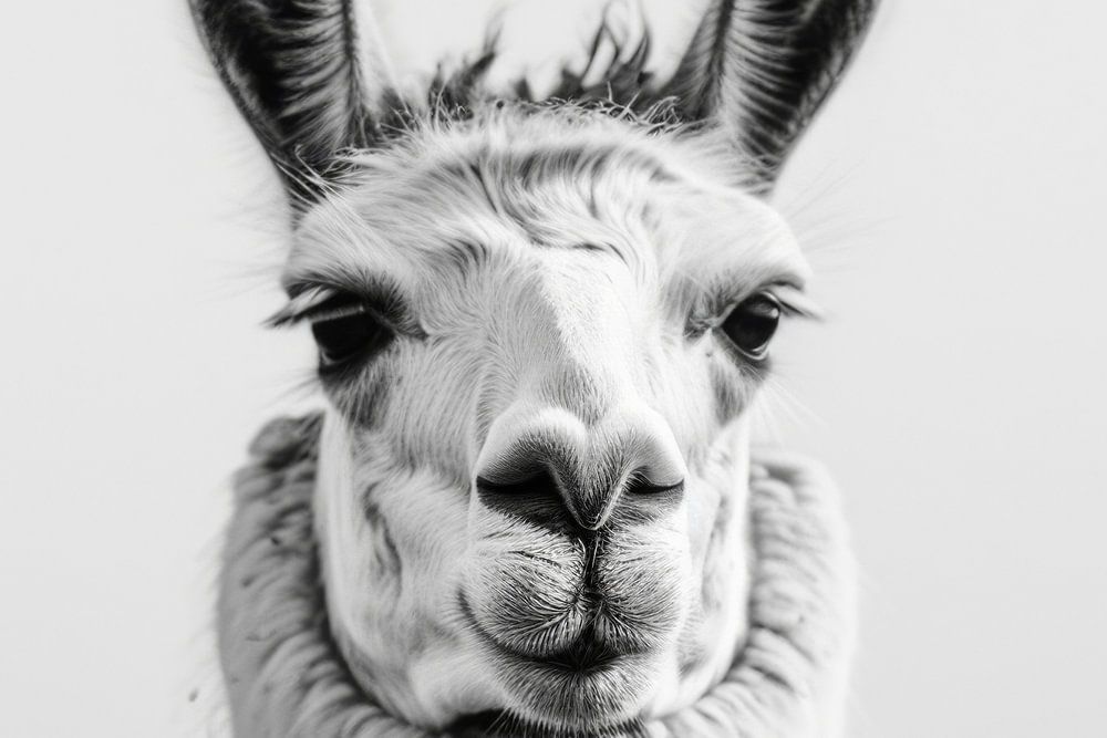 Dieses Schwarz-Weiß-Porträt eines Lamas besticht durch seine detaillierte Darstellung und den charmanten Ausdruck des Tieres. Die klaren Kontraste und die feinen Details des Fells verleihen dem Bild eine zeitlose Eleganz. Perfekt für Liebhaber von Tieren und minimalistischer Kunst, bringt dieses Kunstwerk eine ruhige und stilvolle Note in jede Wohn- oder Arbeitsumgebung.