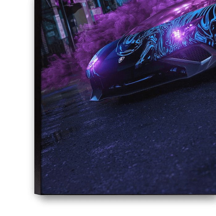 Ein schnittiger, speziell verkleideter Lambo rast durch die neonbeleuchteten Straßen. Dynamische Beleuchtung mit intensivem lilafarbenem und cyanfarbenem Rauch erzeugt eine futuristische Cyberpunk-Ästhetik mit hohem Tempo