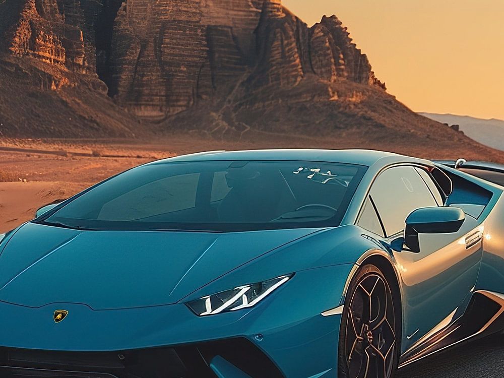 Ein schönes Wandbild eines Lamborghini Auto Sportwagens in der Wüste im Sonnenuntergang. Für alle Auto Fans.