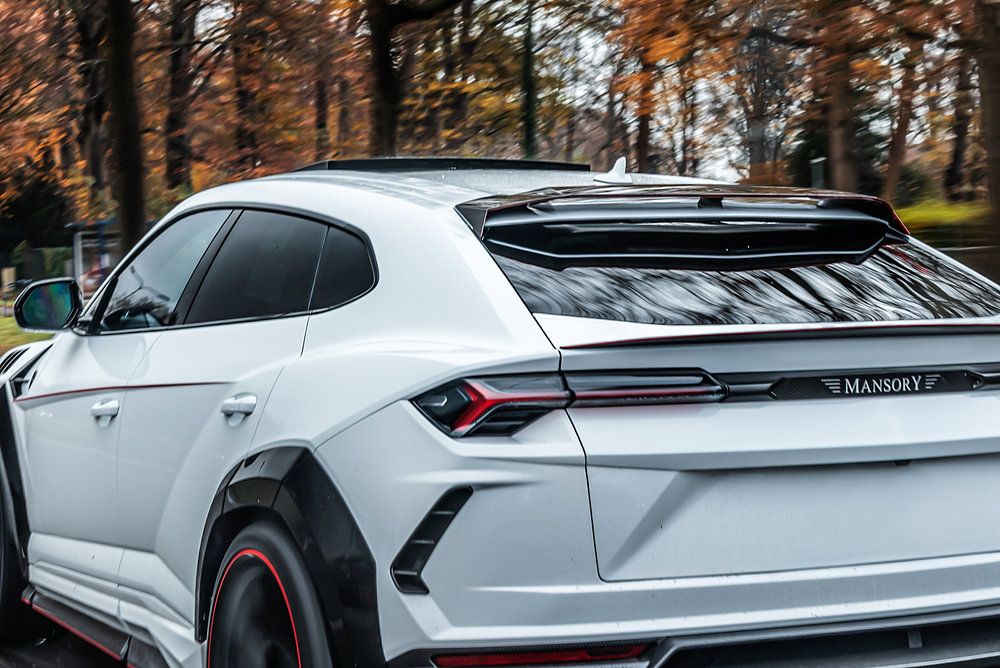 Lamborghini Urus Mansory Venatus mit hoher Geschwindigkeit auf der niederländischen Autobahn. Dieser super exklusive Lamborghini Urus wurde von Mansory vollständig in den Venatus umgebaut.