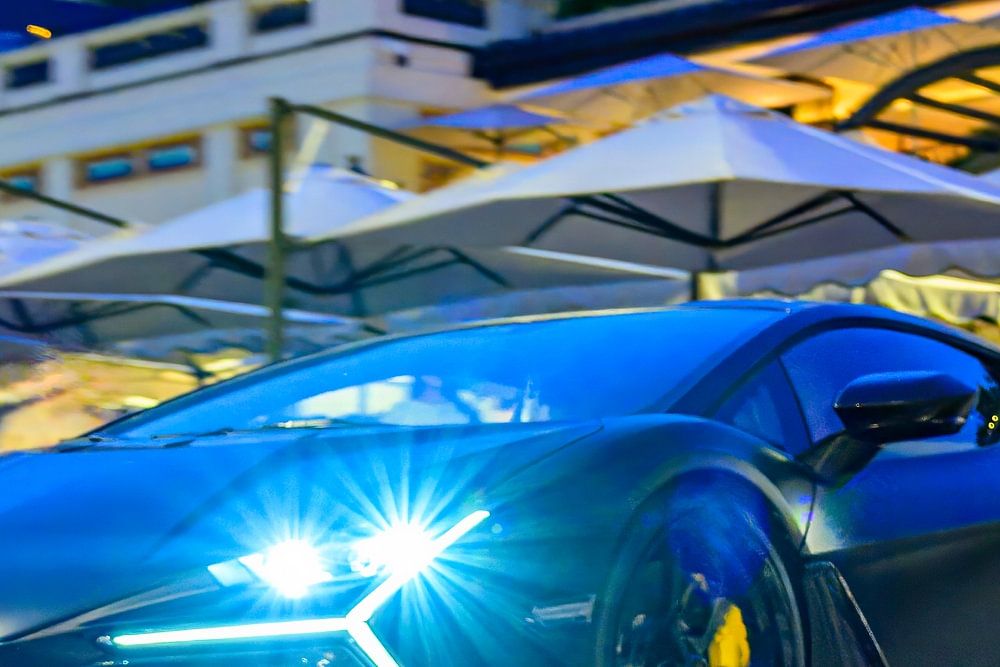 Lamborghini Revuelto Hochleistungs-Supersportwagen bei der Fahrt auf dem Casino-Platz in Monaco. Der Revuelto ist Lamborghinis erster Plug-in-Hybrid HPEV (High Performance Electrified Vehicle), ausgestattet mit einem 6,5-Liter-V12-Motor und drei Elektromotoren, die zusammen eine Leistung von 1.015 PS erbringen. Foto mit Bewegungsunschärfe.
