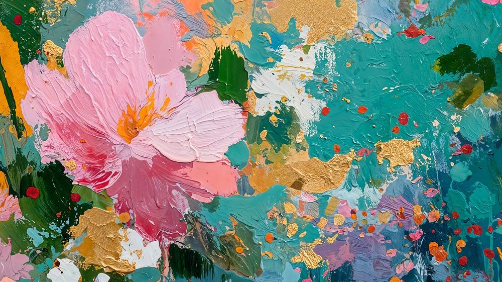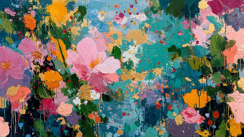 Ein lebendiges und impressionistisches Blumenbild explodiert förmlich in einer Fülle von Farben. Große, zartrosa Blüten wechseln sich mit kleineren Blütenbüscheln ab. Der Hintergrund wurde mit energiegeladenen Pinselstrichen und Spritzern geschaffen, die an einen lebendigen, abstrakten Garten erinnern. Der Gesamteindruck ist der einer…