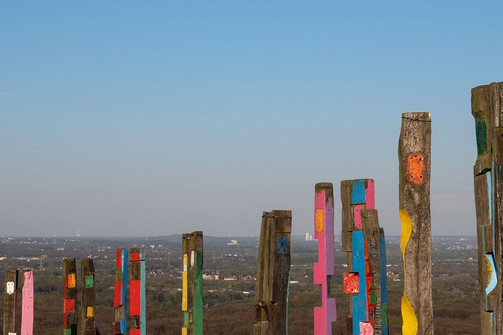 Die Landmarke Totems auf der Bergehalde der ehemaligen Steinkohlezeche Prosper Haniel, Wahrzeichen entlang der Route der Industriekultur im Herzen der Metropole Ruhr, Bottrop, Nordrhein Westfalen, Deutschland