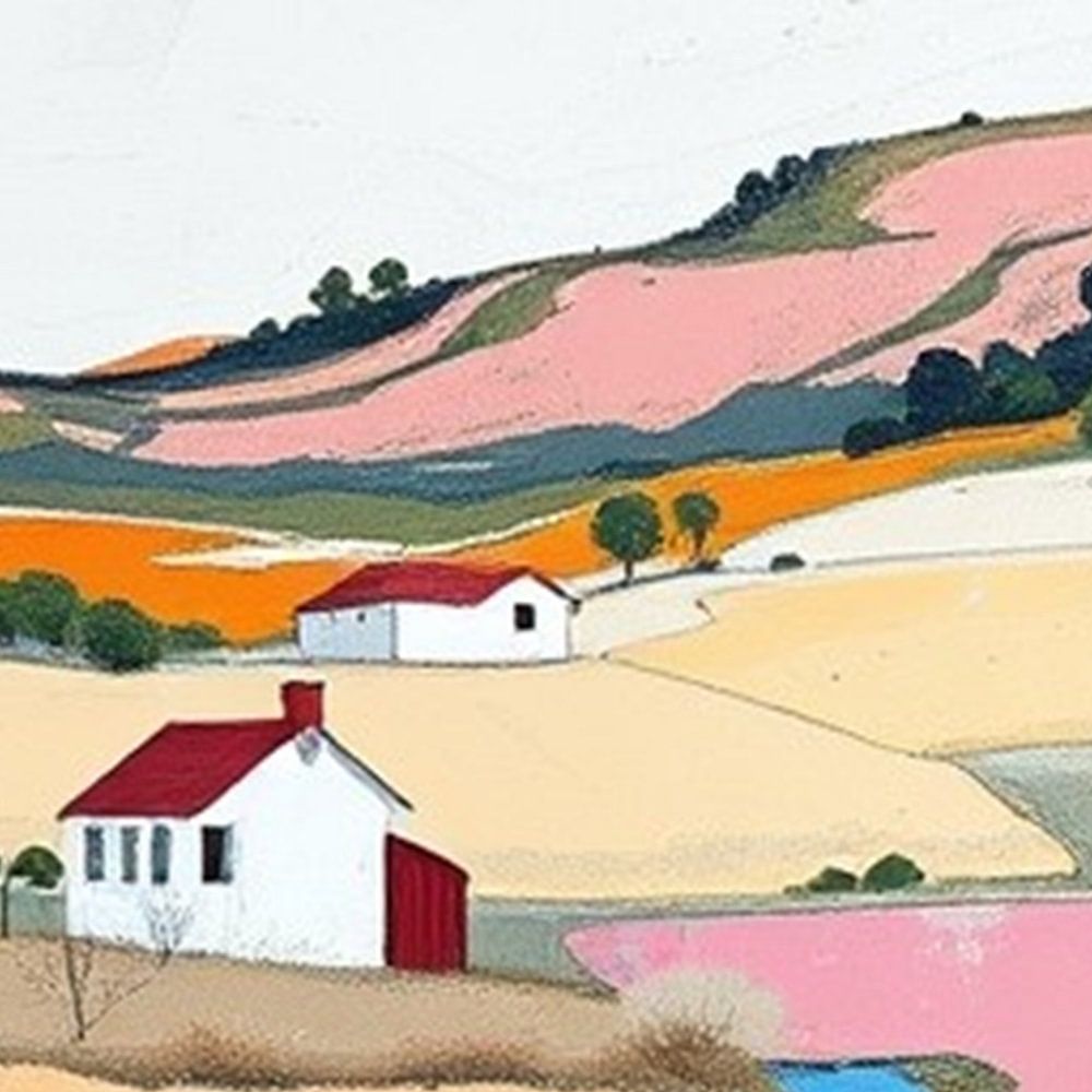 eine fröhliche Landschaft mit roten Dächern und weißen Häusern und Hügeln in rosa, blauen und cremefarbenen Flächen.