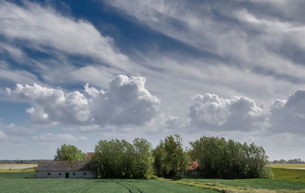 Zwischen Breskens und Groede in West Zeeuws-Vlaanderen liegt dieser alte Bauernhof. Der Hof befindet sich zwischen dem Naturschutzgebiet Waterdunen und dem Seedeich. In diesem Bild ein schöner dynamischer Wolkenhimmel über der Landschaft.