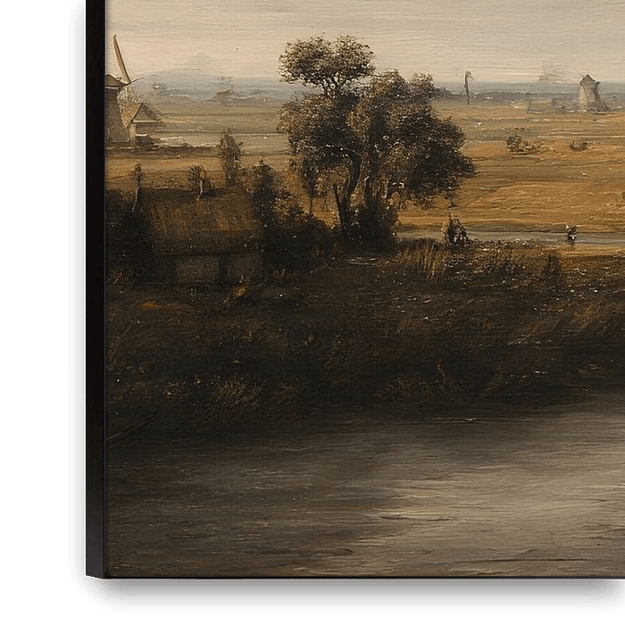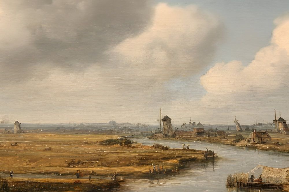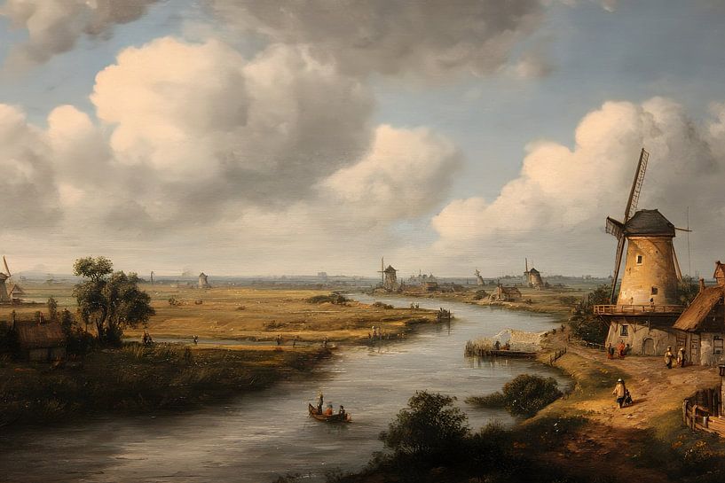Das Gemälde zeigt eine weite niederländische Flusslandschaft, die Zaanse Schans mit Windmühlen, Feldern und vereinzelten Figuren. Ein ruhiger Wasserlauf durchzieht die Ebene, kleine Boote gleiten gemächlich dahin. Die Architektur ist schlicht, funktional und in die Landschaft eingebettet; der Himmel nimmt mit seinen hohen…