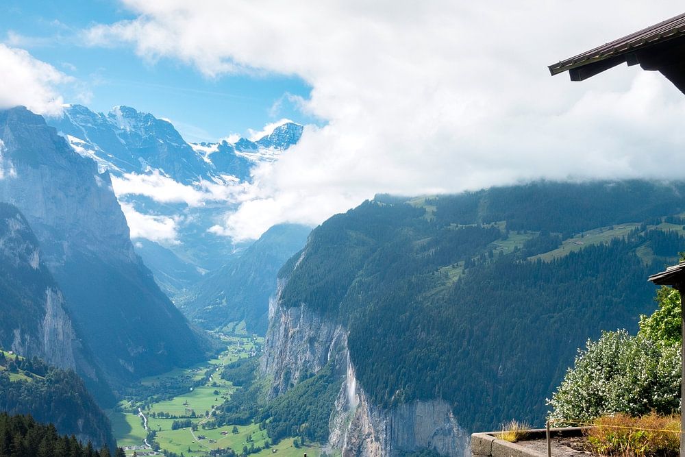 Landschaft mit zwei Holzchalets auf einer grünen Wiese mit Blick auf das Lauterbrunnental, umgeben von den Bergen der Alpen, gesehen von Wengen, Berner Oberland, Kanton Bern in der Schweiz im Sommer.