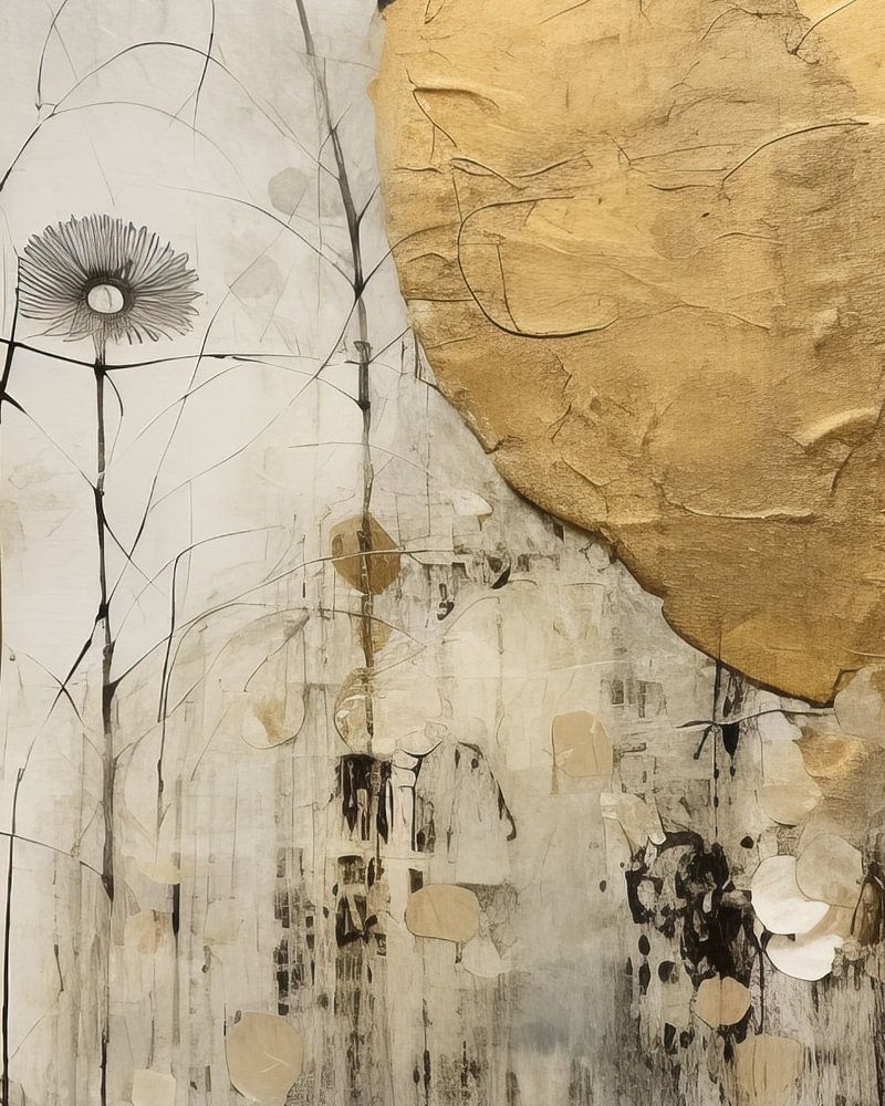 Landschaft im Mixed-Media-Stil mit Goldakzenten. Collage, moderner Schick. Wählen Sie die Größe und das Material für diese Arbeit und machen es zu Ihrem Interieur passen.