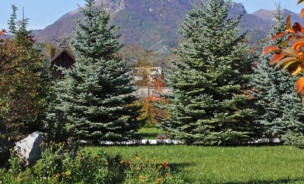 Landschaft mit Bäumen und Berg Beshtau, Nordkaukasus.