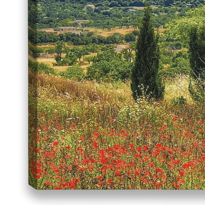 Bestelle dieses Landschafts-Wandbild Landschaft mit Mohnfeld auf der Insel Mallorca. von Voss Fine Art Fotografie als Reproduktion auf Leinwand, Alu-Dibond, als Poster, Fototapete oder Acrylglasbild.
