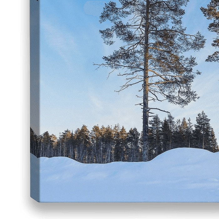 Bestelle dieses Landschafts-Wandbild Landschaft mit Schnee und Bäumen im Winter in Kuusamo, Finnland von Rico Ködder als Reproduktion auf Leinwand, Alu-Dibond, als Poster, Fototapete oder Acrylglasbild.
