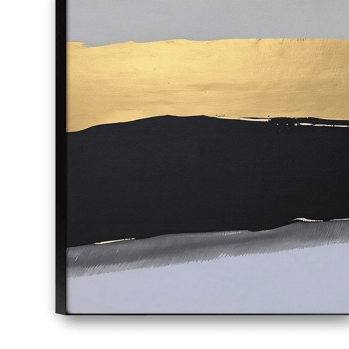Tauchen Sie ein in die Essenz des Minimalismus mit diesem wunderschönen Kunstwerk. Dieses Design ist eine visuelle Poesie der Stille und Ruhe und bringt die heitere Schönheit der Einfachheit in Ihren Raum. Der geschichtete Horizont aus glänzenden Gold- und tiefen Schwarztönen geht nahtlos in subtile Grau- und Beige-Nuancen über und erinnert an eine beruhigende abstrakte Landschaft. Befreit vom Chaos der Farben, vermittelt dieses Stück ein Gefühl von Kontemplation und Luxus. Es ist ideal für alle, die die Schönheit der schlichten Eleganz lieben, und verleiht jedem Wohn- oder Büroraum einen Hauch von moderner Raffinesse. Lassen Sie Ihre Wände sprechen mit diesem Statement-Stück, das zeitlose Klasse ausstrahlt.
