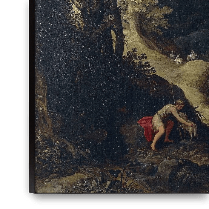 Landschaft mit Johannes dem Täufer, Paul Bril ( 1595) Hier sehen wir den jungen Johannes den Täufer in einem charmanten, typisch flämischen Gemälde. Der Heilige wird durch seine Attribute - das Kreuz, das Lamm und die strenge Wolltunika - identifiziert. Der einsame Ort, an den sich der Vorläufer zurückgezogen hat, ist keine ausgedörrte Wüste, sondern ein üppiger Wald, der von reizenden Tieren bewohnt wird, der vom Gesang unzähliger Vögel belebt wird und in dem es von Insekten und sogar hübschen kleinen Schnecken wimmelt. Auch hier wird die Darstellung einer wichtigen biblischen Figur zur Gelegenheit, ein Genrebild zu schaffen.