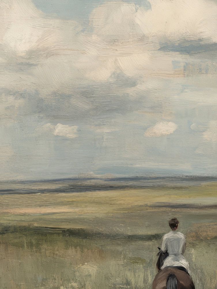 Bestelle dieses Landschafts-Wandbild Landschaft mit einer Dame auf einem Pferd von Japandi Art Studio als Reproduktion auf Leinwand, Alu-Dibond, als Poster, Fototapete oder Acrylglasbild.