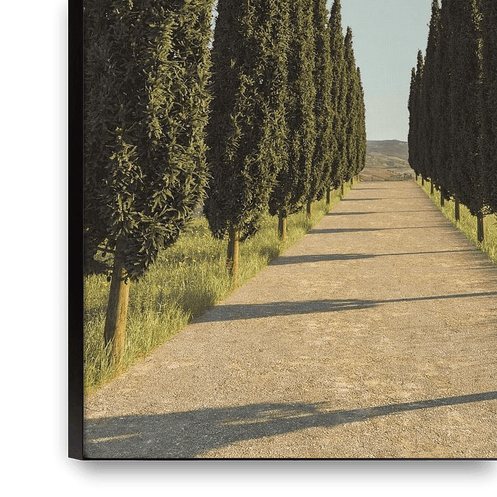 Bestelle dieses Landschafts-Wandbild Landstrasse zwischen mediterranen Zypressen Bäumen von Besa Art als Reproduktion auf Leinwand, Alu-Dibond, als Poster, Fototapete oder Acrylglasbild.