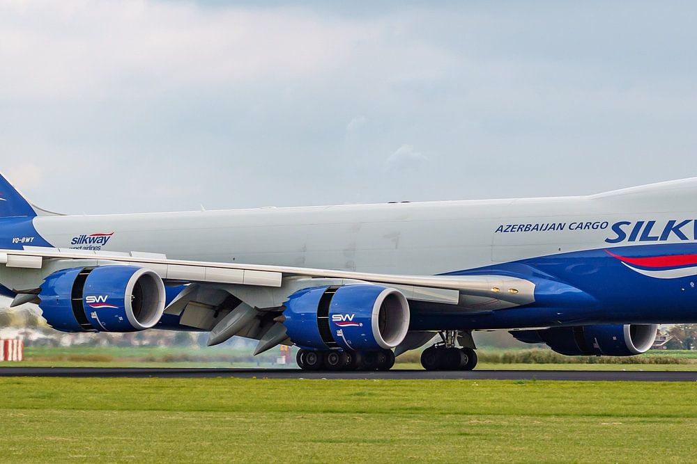 Landung der Boeing 747-8 der Silk Way West Airlines: Das Frachtflugzeug Boeing 747-8 der Silk Way West Airlines ist auf der Polderbaan des Flughafens Schiphol gelandet, Registrierung: VQ-BWY. Ein Aufkleber an der Nase des Flugzeugs erinnert an 80 Jahre Luftfahrt in Aserbaidschan (1938 - 2018). Dieses Foto wurde am 20. Oktober 2018 aufgenommen.