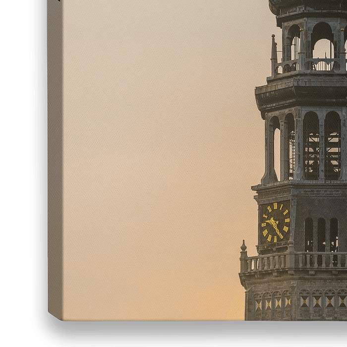 Der Abteiturm von Middelburg, auch bekannt als der Lange Jan. Die Spitze des Turms ist hier isoliert abgebildet. Das Licht der untergehenden Sonne färbt sowohl eine Seite des Turms als auch den Himmel im Hintergrund.