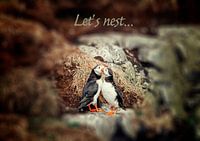 Zwei verliebte Papageientaucher mitten in der Natur mit dem Text „ 'Let's nest' ” (Papageientaucher, Papageientaucher, Papageientaucher, Papageientaucher, Papageientaucher, Papageientaucher, Papageientaucher, Papageientaucher, Papageientaucher, Papageientaucher, Papageientaucher, Papageientaucher, Papageientaucher,…