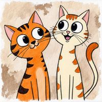 Zwei Katzen mit großen Augen wirken fröhlich und verspielt. Die eine ist orange mit schwarzen Streifen, die andere beige mit orangen Flecken.