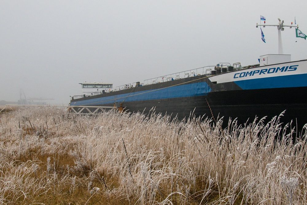 Ein Lastkahn, der an einem Steg in einer weiten Ebene festgemacht hat. Die Einsamkeit im Hafen mit Raureif auf dem Schilf am Ufer. Ein schöner, nebliger Wintertag im Hafen von Amsterdam. Der Lastkahn wartet auf seine neue Reise und seine neue Ladung für die Tanks.