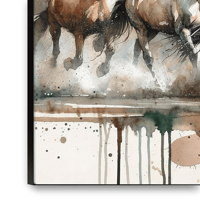 Eine Reihe von Pferden galoppiert gemeinsam über eine offene Ebene und bewegt sich mit wehenden Mähnen und erhobenen Hufen in dieselbe Richtung. Warme Kastanien-, Creme- und Sandtöne formen die Körper, während dunklere Akzente Beine und Schatten definieren. Um die Herde herum erheben sich Staub und verstreute Flecken, und kleine Vögel…
