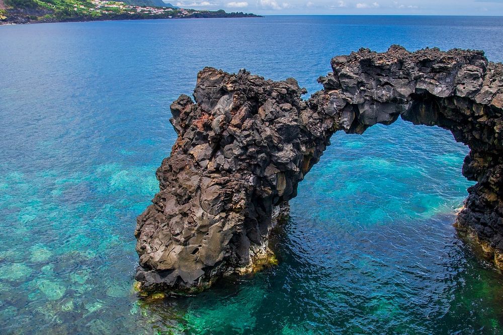 Der beeindruckende Lavafelsenbogen von Fajã da Ribeira da Areia auf der Insel São Jorge ist eine der bemerkenswertesten Natursehenswürdigkeiten der Azoren. Diese einzigartige Felsformation, die durch jahrhundertealte vulkanische Aktivität und die kontinuierliche Arbeit des Ozeans entstanden ist, stellt ein majestätisches Kunstwerk an der Küste dieser wunderschönen Insel dar.