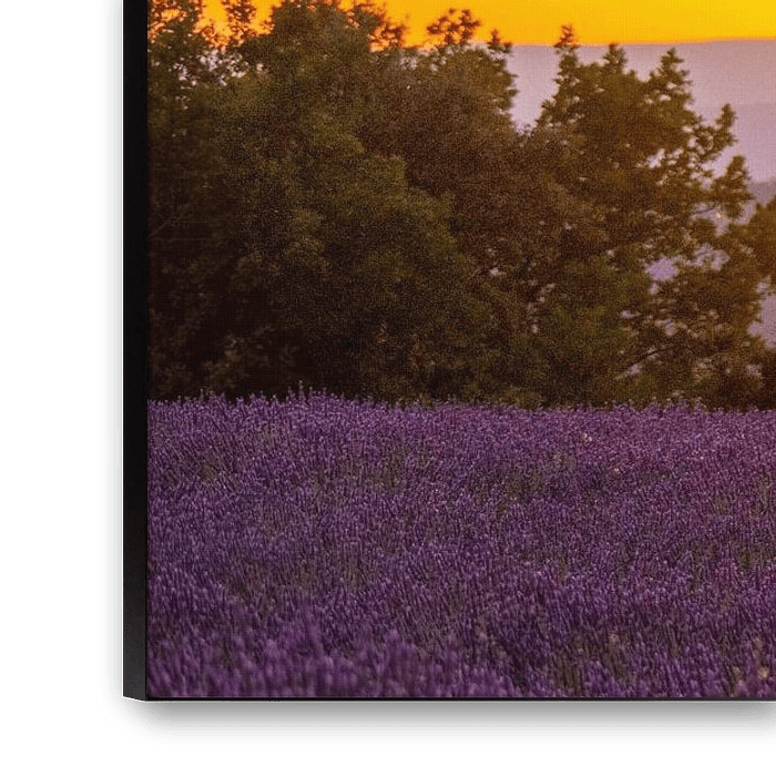 Blühende Lavendelblüten auf der Hochebene von Valensole in der Provence bei Sonnenuntergang nach einem sommerlichen Sonnenuntergang. Die Blütezeit ist je nach Wetterlage und Höhenlage zwischen Ende Juni und Mitte Juli. Die Luft ist erfüllt vom Summen der Bienen, und der Duft von Lavendel durchdringt die Luft. In der Nähe wachsen goldene Weizenfelder, die einen farbenfrohen Kontrast bilden. Zu den lokalen Produkten gehören Lavendelöl, Seifen, Liköre und Honig.