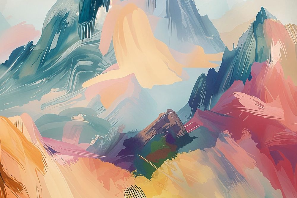 Dieses moderne abstrakte Gemälde fängt die Essenz der farbenfrohen Berge mit einer sanften und doch dynamischen Farbpalette ein. Die übereinanderliegenden Pinselstriche erzeugen ein faszinierendes Gefühl von Tiefe und laden den Betrachter ein, durch die wellenförmigen Formen der Berglandschaft zu wandern. Mit einer harmonischen Mischung aus warmen und kühlen Tönen strahlt das Kunstwerk Ruhe und Ausgeglichenheit aus und evoziert die zeitlose Schönheit der Natur in einem zeitgenössischen Stil. Perfekt für Liebhaber des Zusammenspiels zwischen Abstraktion und der organischen Welt.