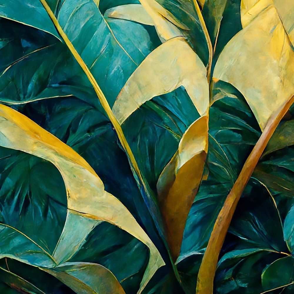 Eine üppige Palette von tropischen Blättern, darunter Monstera. Lebendige Komposition aus blauen, grünen und ockerfarbenen Tönen.