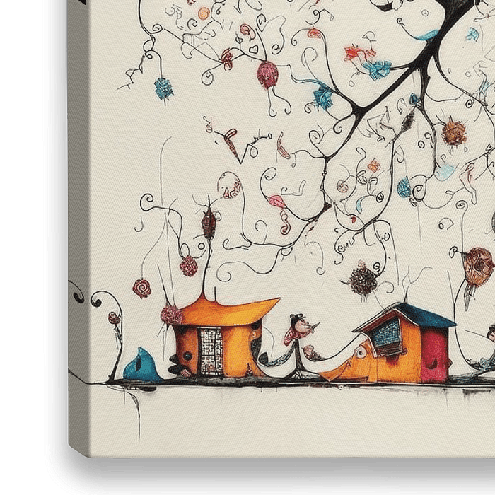 Der Baum ist mit einer Vielzahl von farbenfrohen Häusern geschmückt, als wäre er ein Dorf für sich. Jedes Haus hat seinen eigenen Charakter und…