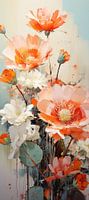Lively Canvas | Floral Painting - Dies ist eine lebendige und dynamische Komposition, die eine Sammlung von Blumen darstellt, die mit ihren subtilen Nuancen und stilisierten Formen ein impressionistisches Flair ausstrahlen. Die Blumen in warmen Orange- und kräftigen Korallentönen bilden einen schönen Kontrast zu den erfrischenden weißen…