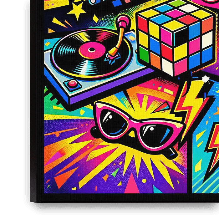 Kühnes und energiegeladenes Pop-Art-Kunstwerk mit ikonischen Retro-Elementen wie einer Jukebox, einem Mixtape, einem Rollschuh, einer Boombox, einer Schallplatte, einem Rubik's Cube und Eiscreme. Leuchtende Neonfarben und dynamische Kompositionen bringen spielerische Nostalgie und einen besonderen Stil in moderne Innenräume.