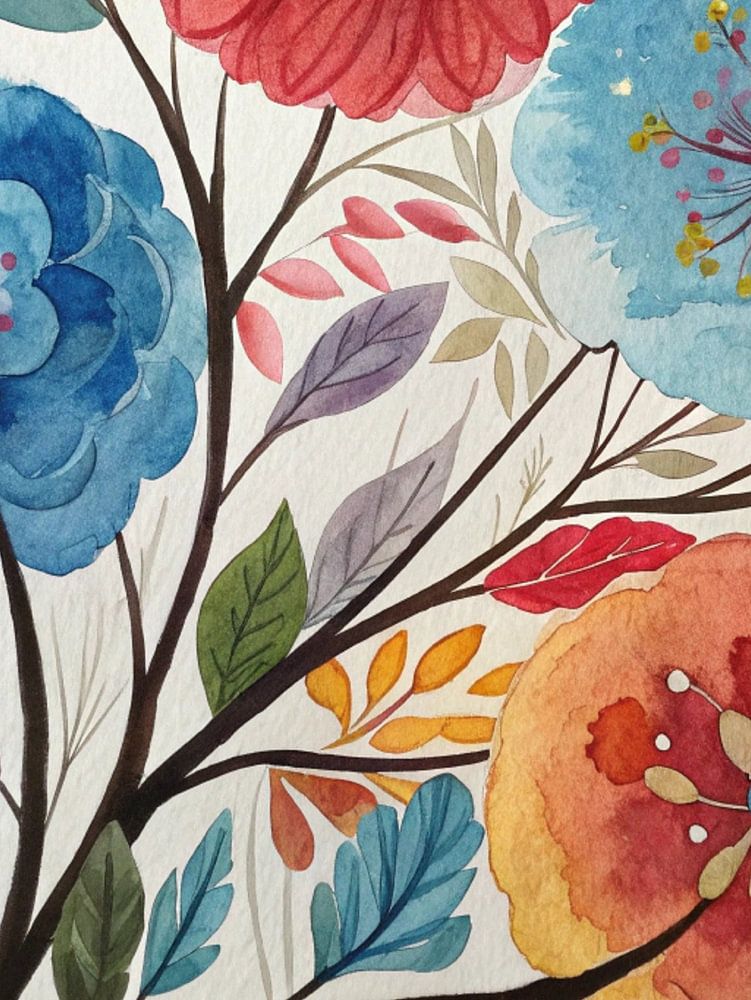 Die Blüten sind durch einen dunklen, gewundenen Zweig miteinander verbunden, der durch eine Reihe von Blättern in verschiedenen herbstlichen und kühlen Farbtönen ergänzt wird, die dem Bild Tiefe und visuelles Interesse verleihen. Das Aquarellmedium verleiht dem Werk eine schöne, organische Textur mit subtilen Verwaschungen und ausdrucksstarken Pinselstrichen.