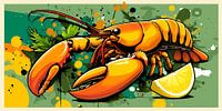 Eine farbenfrohe und stilisierte Darstellung eines Hummers vor einem gesprenkelten Hintergrund.