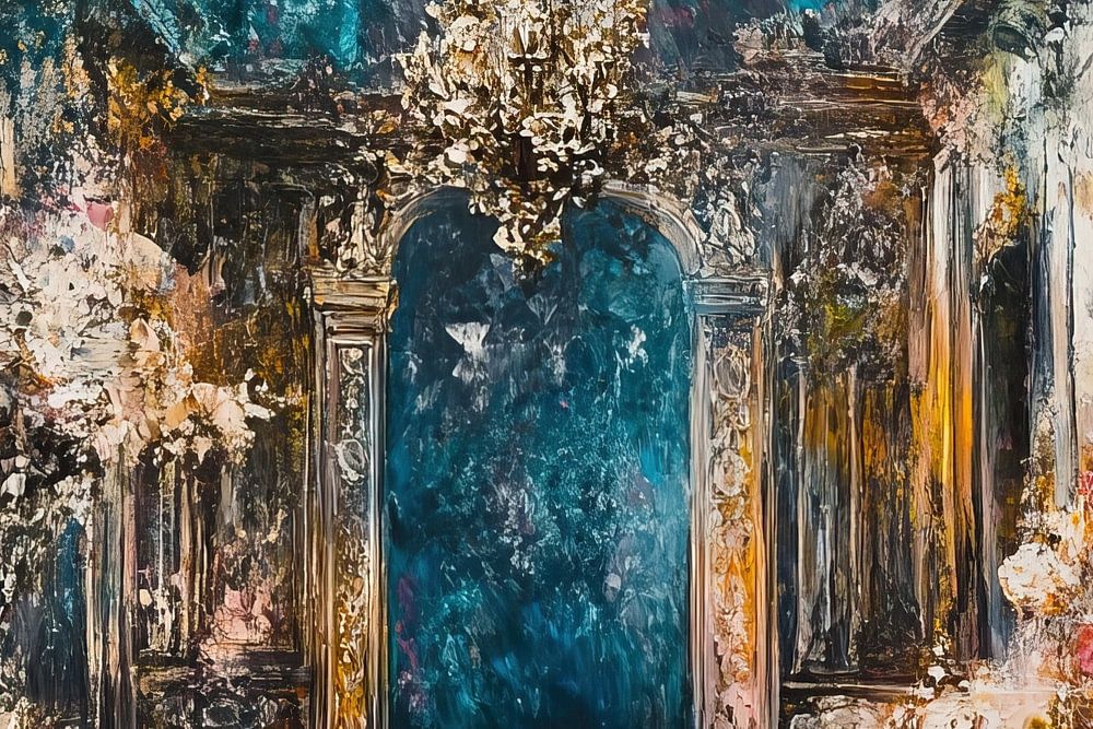 Vivid Rococo Room Expression - Dieses architektonische Gemälde zeigt einen detailreichen Rokokosaal mit üppigen Blumenmotiven in leuchtenden Farben und einem zentral platzierten klassischen Portal unter einem beeindruckenden Kronleuchter. Alles ist mit dynamischen, ausdrucksstarken Pinselstrichen gemalt, die dem klassischen Stil eine moderne Note verleihen.