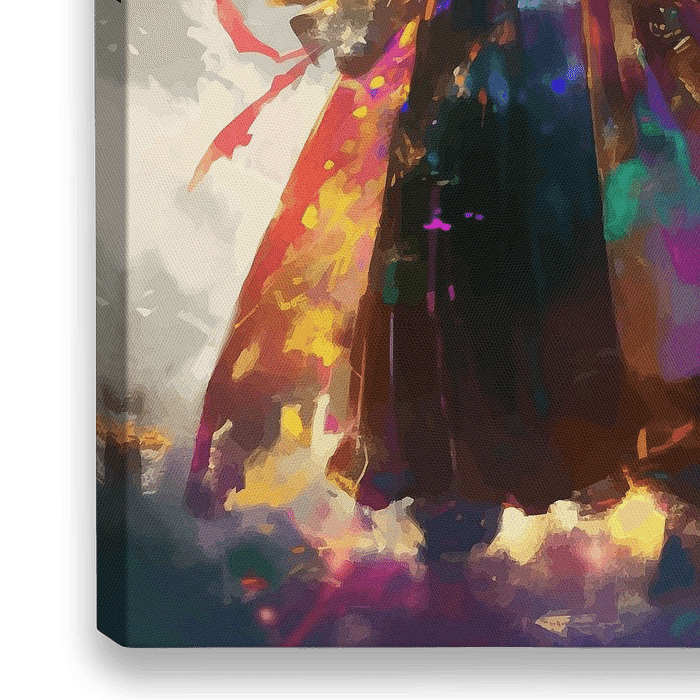 Ein Samurai-Krieger steht majestätisch da, getaucht in ein Spektrum leuchtender Farben, die um ihn herum zu fließen und zu tanzen scheinen. Sein Kopf ist mit wallendem weißen Haar geschmückt, und er hält sein Schwert in einer Haltung, die Stärke und Bereitschaft ausstrahlt. Das Gewand, das er trägt, ist ein Kaleidoskop von Farben, in…