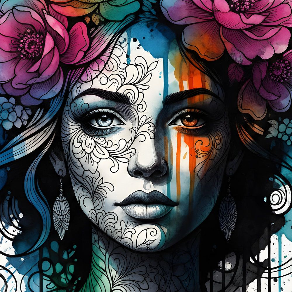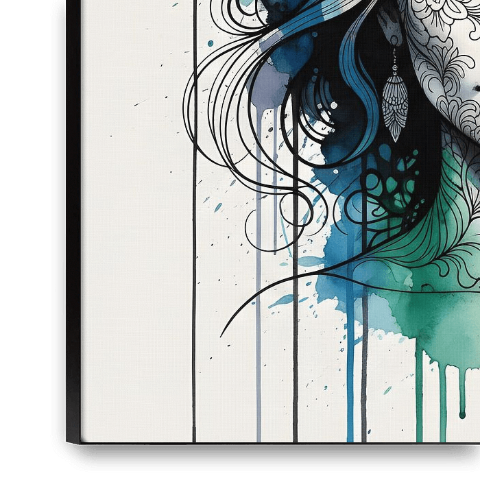 Diese fesselnde Mixed-Media-Illustration verbindet die Präzision feiner Tuschearbeiten mit der flüssigen Unberechenbarkeit von Aquarellspritzern. Im Mittelpunkt steht eine einfarbige weibliche Figur, deren Haut mit filigranen, spitzenartigen Mustern verziert ist, die auf eine tief verwurzelte Verbindung zur Natur und zum Erbe hinweisen.…