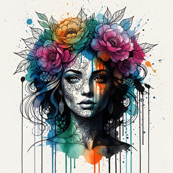 Über „Lebendiges Aquarell Frau mit Blumenkrone“ von Clay Artista