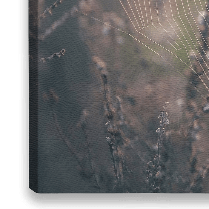 Nahaufnahme eines Spinnennetzes zwischen Heidekrautpflanzen in der Leersumse veld in Leersum, Utrecht. Das goldene Licht der aufgehenden Sonne verleiht dem Foto eine warme Atmosphäre.