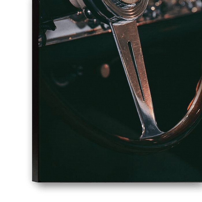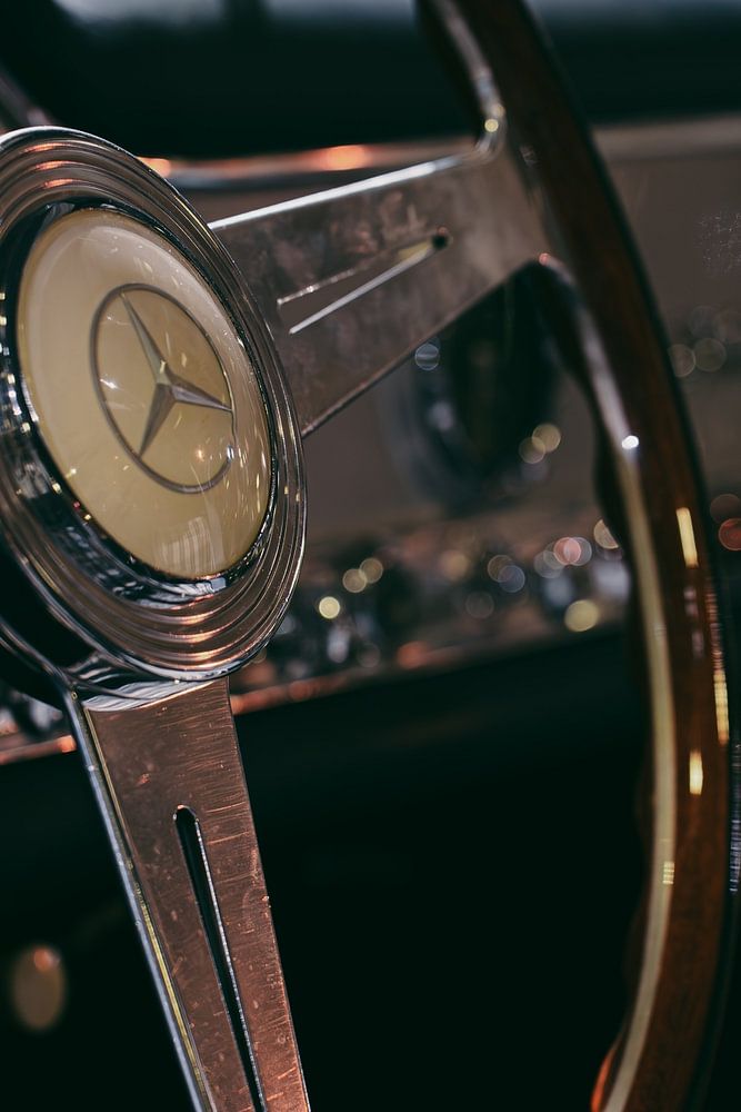 Detailaufnahme eines klassischen Lenkrads eines Mercedes Benz 300SL, Flügeltürer.