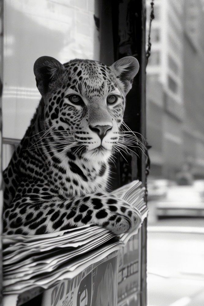 Diese Schwarz-Weiß-Fotografie zeigt eine surreale Straßenszene im New York der 1970er Jahre, in der sich ein Leopard lässig in einem Zeitungsständer eingenistet hat. Das majestätische Tier liegt ruhig zwischen den Zeitungsstapeln, als ob es ein alltäglicher Anblick in der Stadt wäre. Im Hintergrund ist eine belebte Straße mit einem Oldtimer zu sehen, was der Szene eine nostalgische Atmosphäre verleiht. Die Kombination aus dem wilden Tier und der städtischen Umgebung schafft eine faszinierende und künstlerische Komposition, die auch einen humorvollen Blick auf die Grenzen zwischen der Natur und der menschlichen Welt wirft.