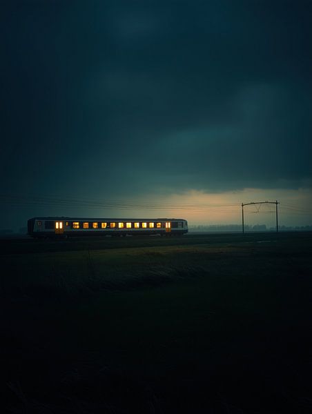 Ein einsamer Zug fährt durch die flache Landschaft, die in ein Meer aus Dunkelheit und bedrohlichen Wolken getaucht ist. Der Himmel hängt schwer und tief über dem Land, als ob die Nacht jeden Moment hereinbrechen könnte. Nur das warme, gelbe Licht aus den Zugfenstern durchbricht die kühlen Grün- und Blautöne. Drinnen sitzen Menschen auf…