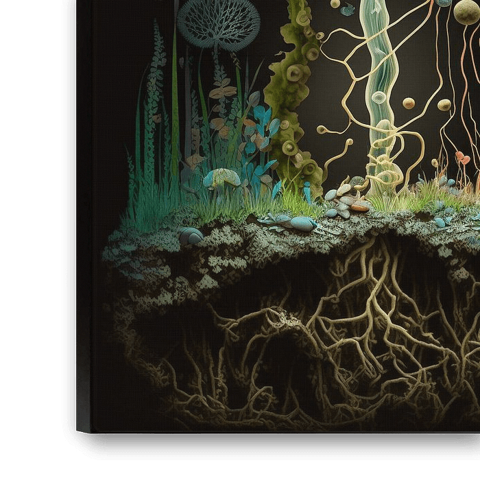 Betreten Sie einen magischen Wald mit dieser lebendigen Illustration von leuchtenden Pilzen, die vor einem tiefen, dunklen Hintergrund leuchten. Umgeben von zarten Pflanzen und einem verschlungenen Wurzelgeflecht strahlt jeder Pilz in satten Orange-, Blau-, Violett- und Grüntönen und schafft eine traumhafte Atmosphäre. Die feinen Details und die harmonische Komposition erwecken das Geheimnis und das Wunder eines verborgenen Waldreiches. Dieses hochauflösende Kunstwerk eignet sich perfekt für Liebhaber von Fantasy-Kunst, Dekoration mit Naturthemen oder Geschichtenerzählen und verleiht jedem Raum einen Hauch von Zauber.