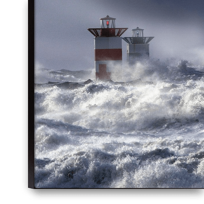 Bestelle das Foto Leuchttürme im Sturm bei Scheveningen von Ronald van der Horst als Reproduktion auf Leinwand, Alu-Dibond, als Poster, Fototapete oder Acrylglasbild.