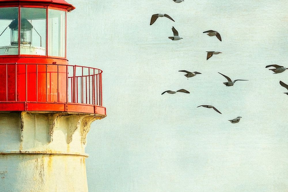 Ein strahlend rotes Licht erhellt die Küste, während Vögel in eleganten Bögen über den Wellen tanzen. Der alte Leuchtturm, von der Zeit gezeichnet, bewacht seit Generationen das Meer und lädt dazu ein, die Geschichten der Weiten zu erahnen. Sanfte Farben und nostalgische Texturen verströmen ein Gefühl von Ruhe und Freiheit.