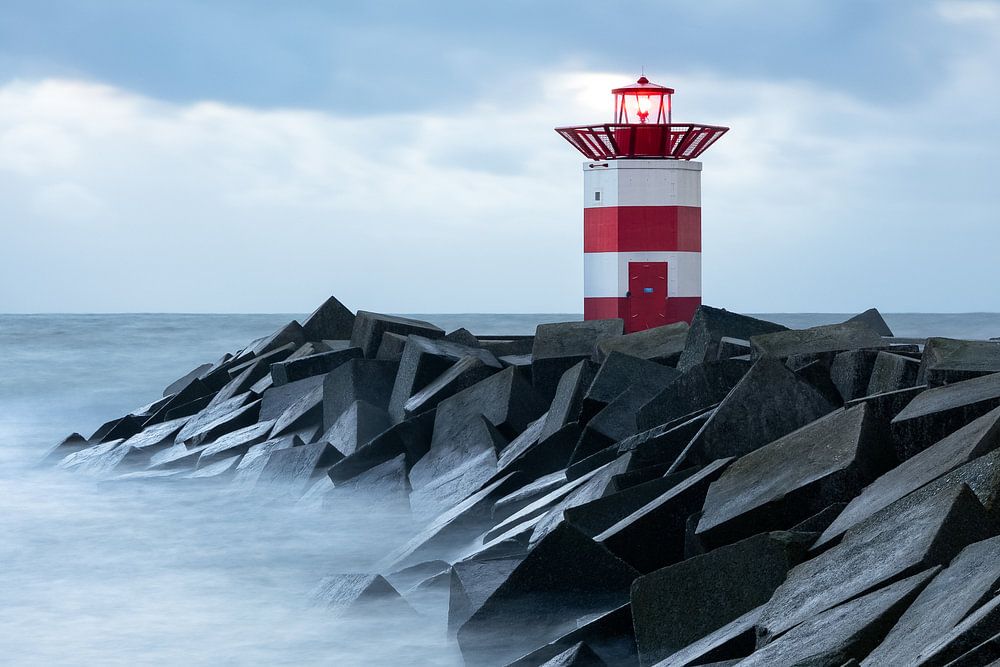 Der Leuchtturm auf der Südmole an der Küste von Scheveningen. Dieses Bild wurde während der blauen Stunde aufgenommen, kurz vor einem aufziehenden Sturm.